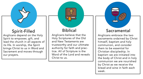 Distinctive features of Anglican beliefs can be found in the Book of Common Prayer which includes the Thirty-Nine Articles. Above all, Anglicans believe that the life, death, and resurrection of Jesus Christ is the gospel that sets people free, renews our broken world, and thus is central to every aspect of life and ministry. Our relationship with Christ grows as we encounter him in Scripture, Sacraments, Spirit, and Service: